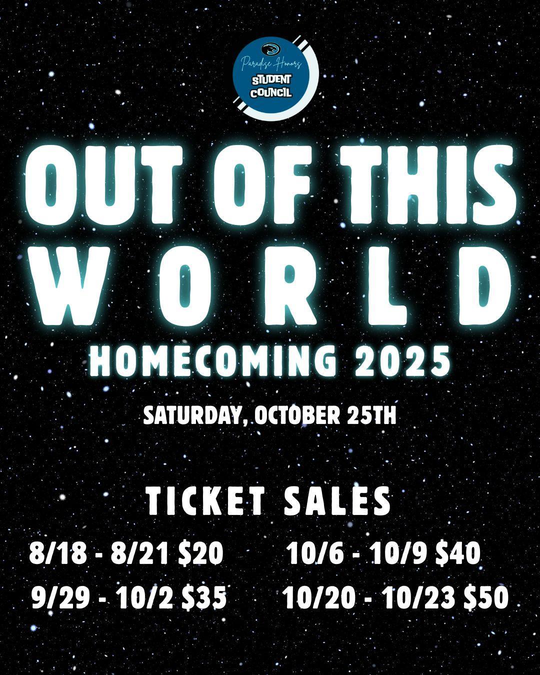 The 2025 PHHS Homecoming Dance is going to be OUT OF THIS WORLD 👽🌕✨ Grab your #phhshoco tickets this week! 🎟 Tickets are on sale during lunches only and can be purchased with cash, card, or Apple Pay 💵 Students will need a signed permission slip (pick one up in front office or in D106) and their student ID to purchase a homecoming ticket.