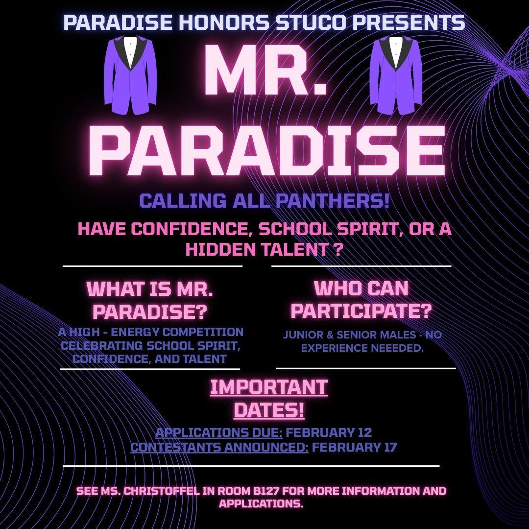 PHHS presents MR. PARADISE!!! Have confidence, school spirit, or a hidden talent? We are looking for the next Mr. Paradise!!