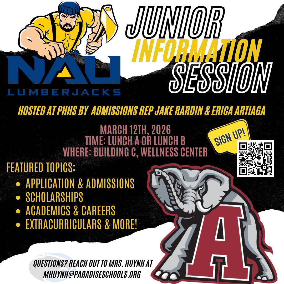 Junior Info Session! Juniors will have the opportunity to meet with Jake Rardin from Northern Arizona University and Erica Artiaga from the University of Alabama on March 12 from 11:30 a.m. – 1:00 p.m.